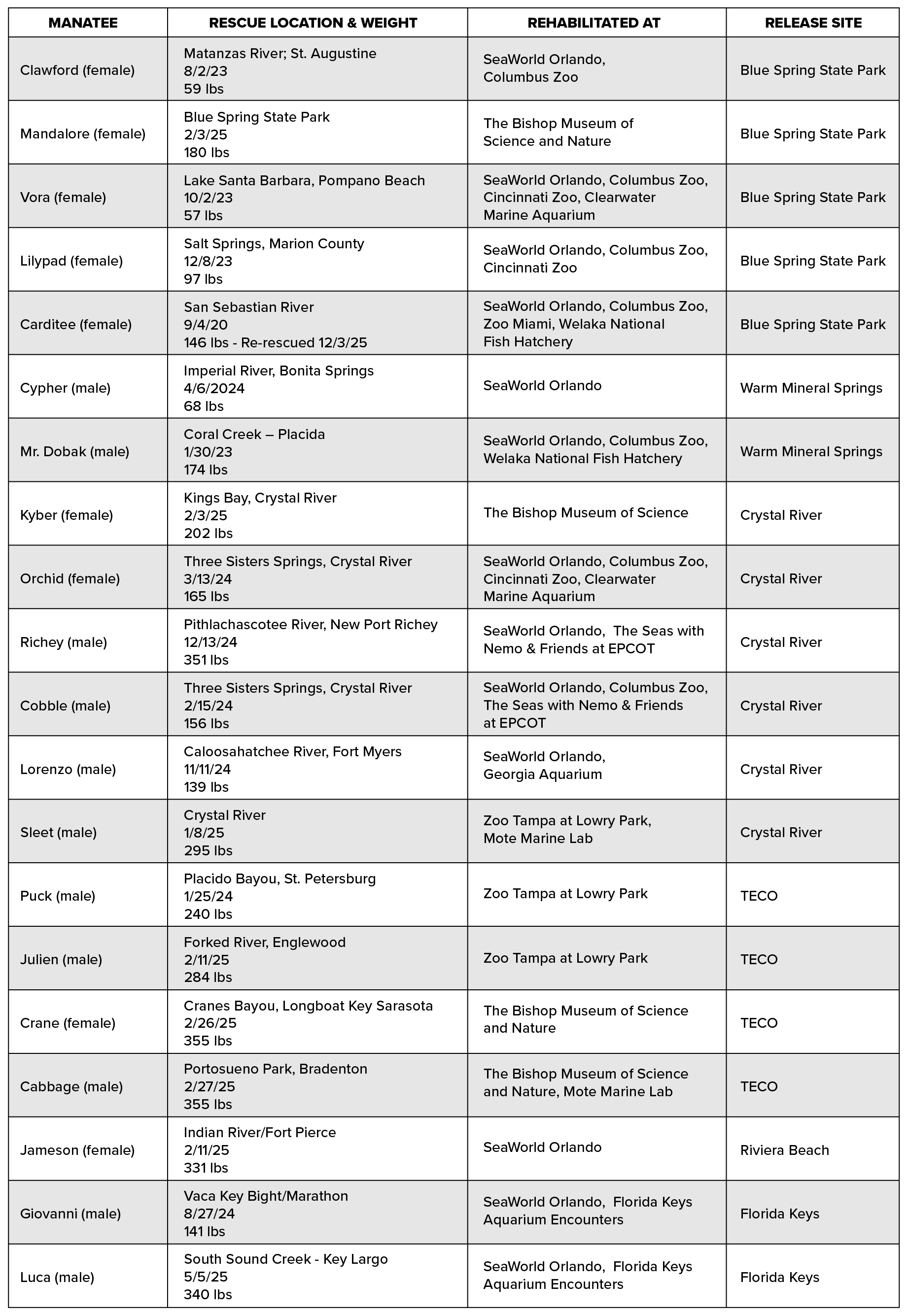 The MRP is a cooperative group of non-profit, private, state, and federal entities that work together to rescue, rehabilitate, release, and monitor sick and injured manatees. Most of the manatees were originally rescued as small orphans or young animals affected by cold stress syndrome between 2022 and 2025 by the Florida Fish and Wildlife Conservation Commission (FWC) and MRP partners. Over the course of their rehabilitation, organizations including SeaWorld Orlando, ZooTampa at Lowry Park, The Seas with Nemo & Friends at EPCOT, the Columbus Zoo, the Cincinnati Zoo & Botanical Garden, Brevard Zoo, Georgia Aquarium, Clearwater Marine Aquarium, Clearwater Marine Aquarium Research Institute (CMARI), The Bishop Museum of Science and Nature, Mote Marine Laboratory and Aquarium, Florida Keys Aquarium Encounters, Zoo Miami, the U.S. Fish and Wildlife Service, the University of Florida, and Save the Manatee Club worked together to provide the long-term care needed to prepare these manatees for return to the wild.